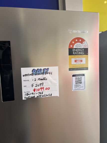 Brand: WESTINGHOUSE Model: WSE6630SA Volume: 624 Litres Dimensions: 1780mm Height x 911mm Width x 746 mmDepth Energy Star Rating: 4.5