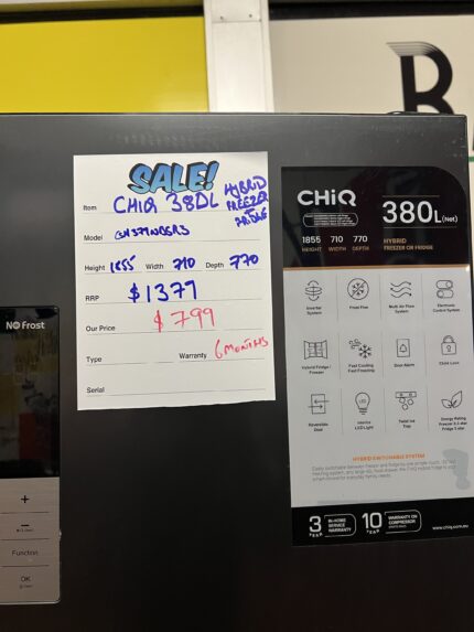 REFURBISHED CHIQ 380 L UPRIGHT-HYBRID FREEZER/ FRIDGE FOR $ 799 Brand: CHIQ Model: CSH379NBSR3 STARS : 5 Dimensions: 1855 Height