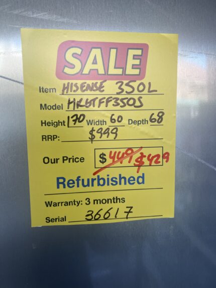 REFURBISHED HISENSE 350 L TOP MOUNT FRIDGE FOR $429 Brand: HISENSE Model: HR6TFF350s Dimensions: 170 Height x 60 Width x