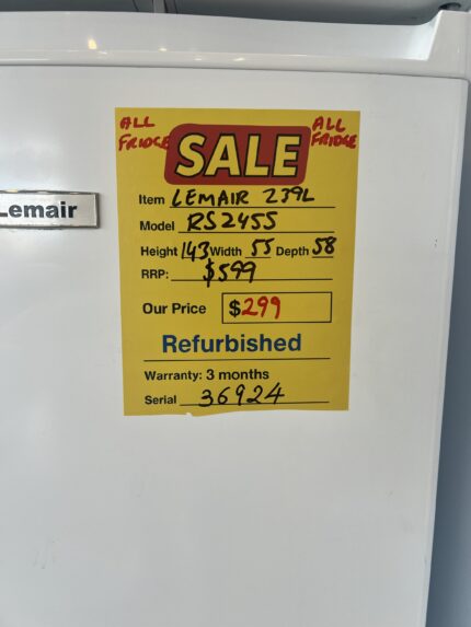 REFURBISHED LEMAIR UPRIGHT FRIDGE FOR $299 Brand: LEMAIR Model: RS245S Dimensions: 143 Height x 55 Width x 58 cmDepth Colour: