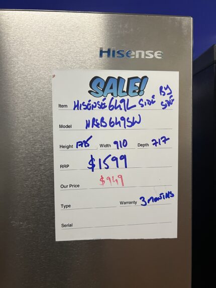 REFURBISHED HISENSE 649 L SIDE BY SIDE FOR $ 949 Brand: HISENSE Model: HRSB649SW STARS : 4 Dimensions: 1795 Height