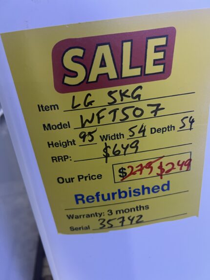REFURBISHED LG 5 Kg top mount washing machine FOR $249 Brand: LG Model: WFT507 Dimensions: 95 Height x 54 Width