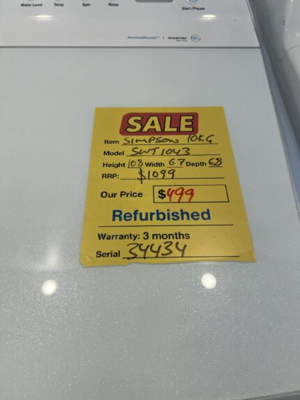 REFURBISHED SIMPSON 10 KG TOO LOADER WASHING MACHINE for $499 Brand: SIMPSON Model: SWT1043 Dimensions: 108 Height x 67 Width