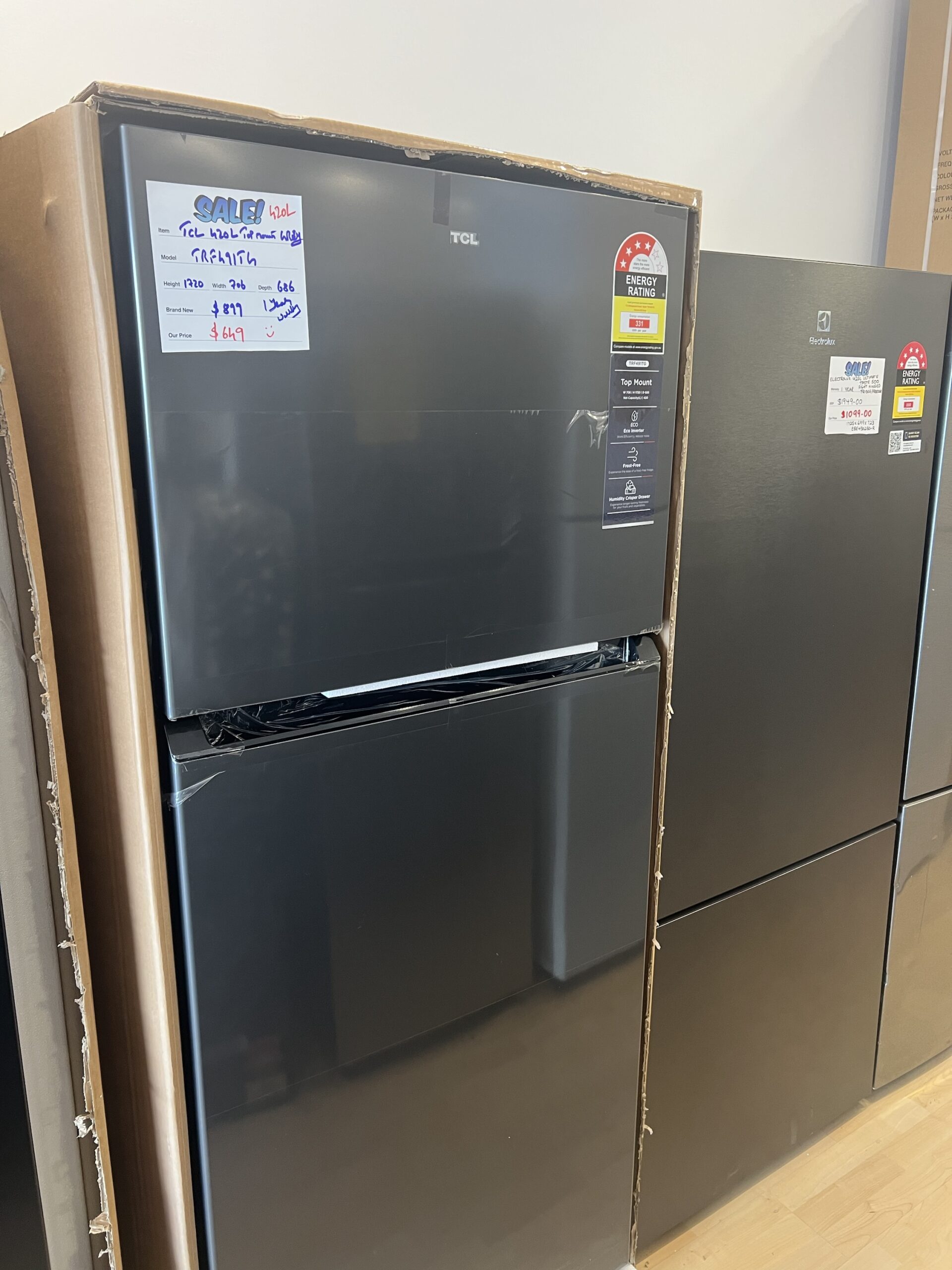 BRAND NEW TCL 420 L TOP MOUNT GREY FRIDGE FREEZER FOR $649
