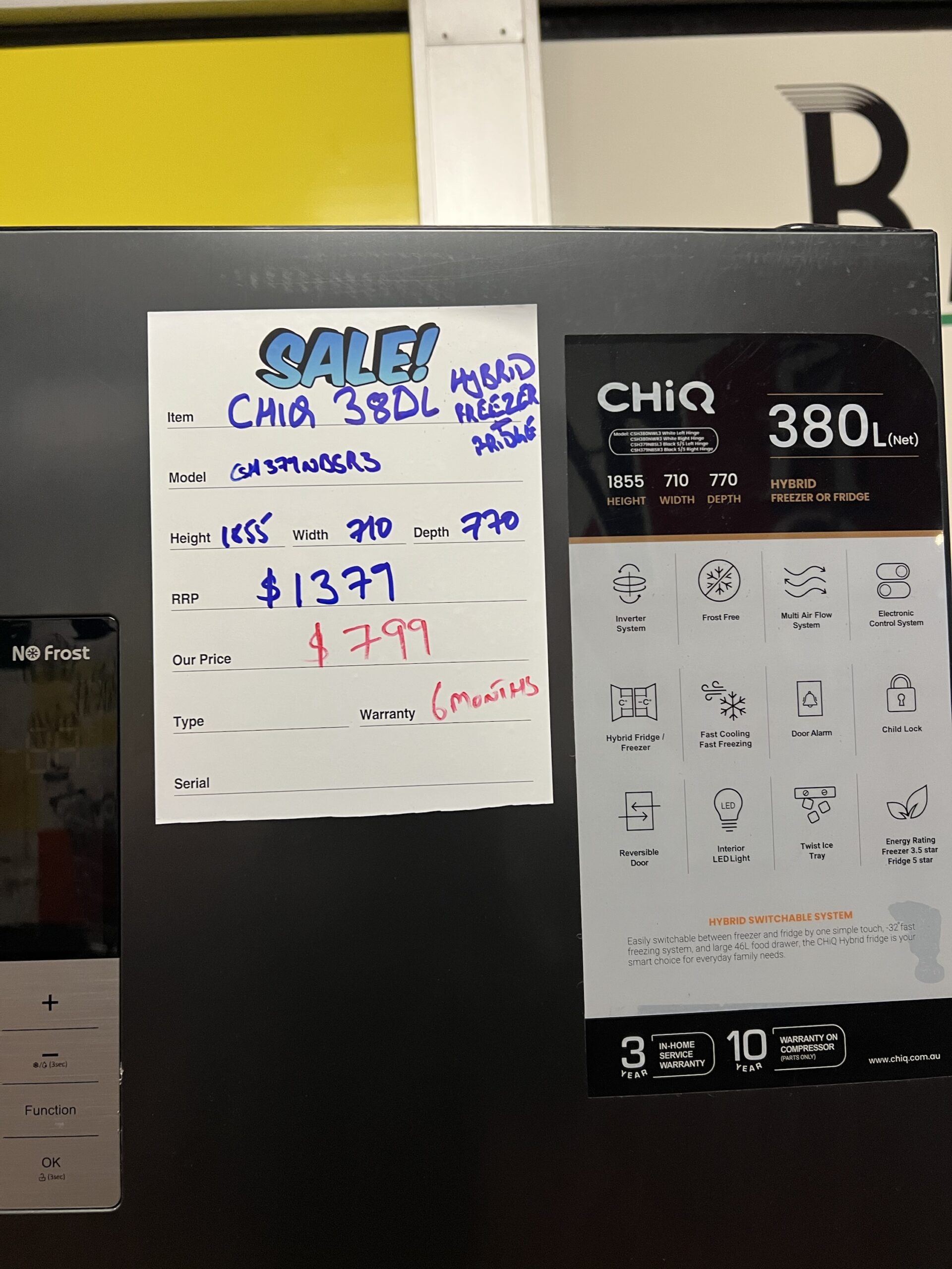 BRAND NEW FACTORY SECONDS CHIQ 311 L HYBRID FREEZER OR FRIDGE FOR $799 MODLE # CSH311NWL3 HEIGHT- 1570 MM WIDTH-