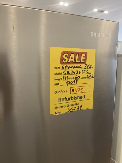 REFURBISHED SAMDUNG 343 L TOP MOUNT FRIDGE FOR $479 Brand: SAMSUNG Model: SR343LSTC Dimensions: 172 Height x 60 Width x