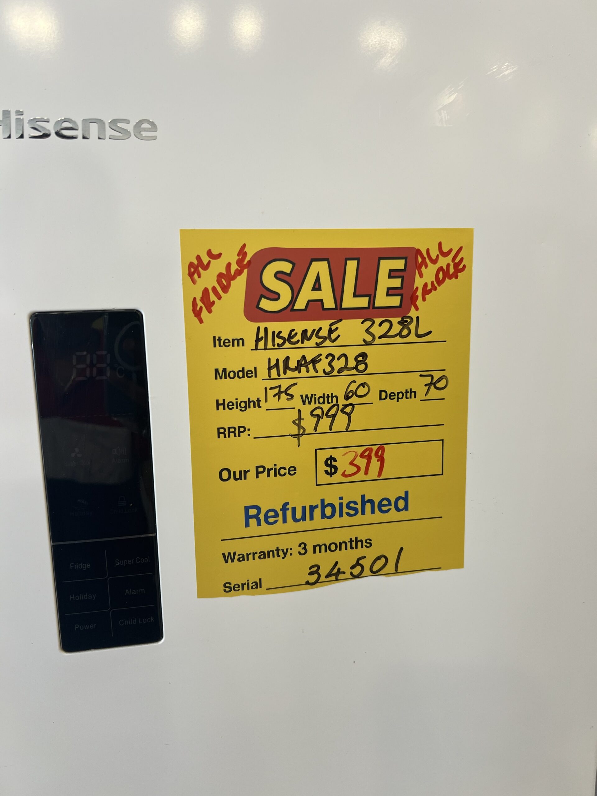 REFURBISHED HISENSE 328 L UPRIGHT-FRIDGE FOR $ 399