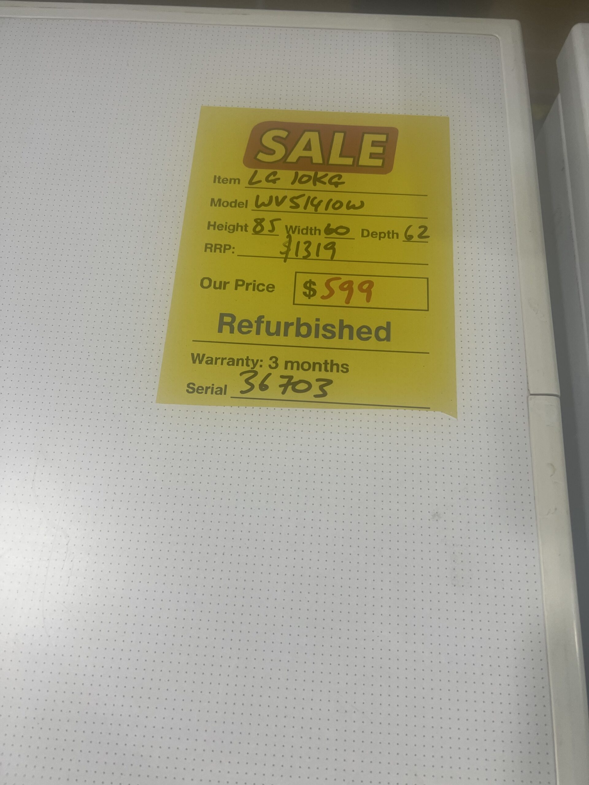 REFURBISHED LG 6.5 kG TOP LOADER FOR $ 319 Brand: LG Model: Volume: 6.5 Dimensions: 96 Height x 59 Width
