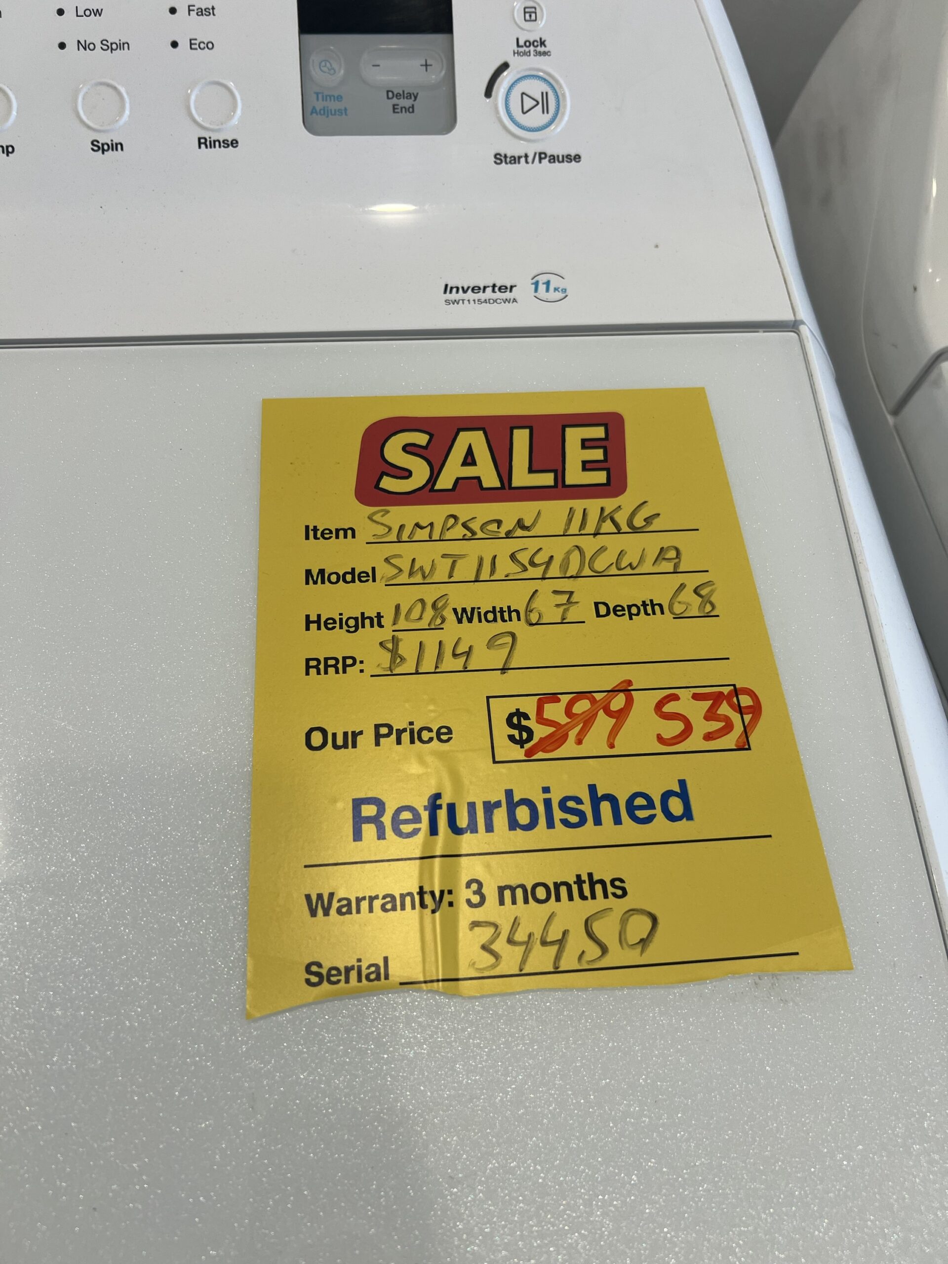 REFURBISHED SIMPSON 11 KG TOO LOADER WASHING MACHINE for $539