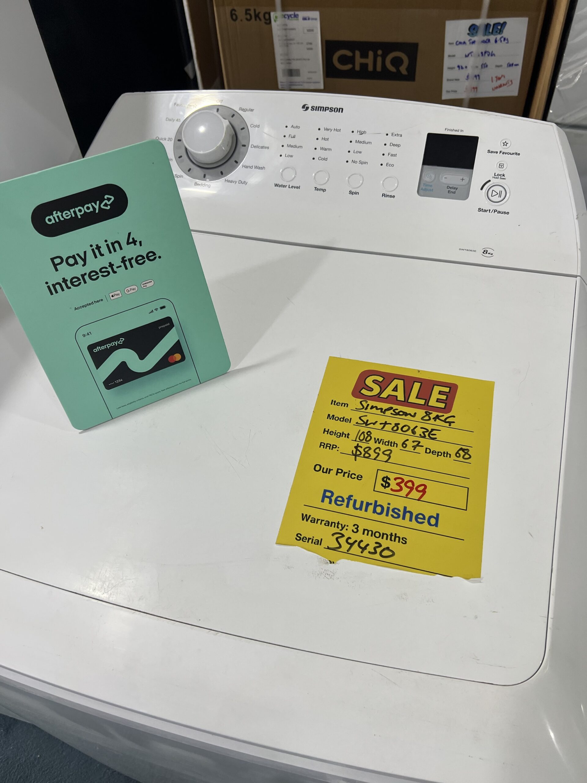 REFURBISHED SImpson 8 KG TOP LOADER WASHING MACHINE FOR $399