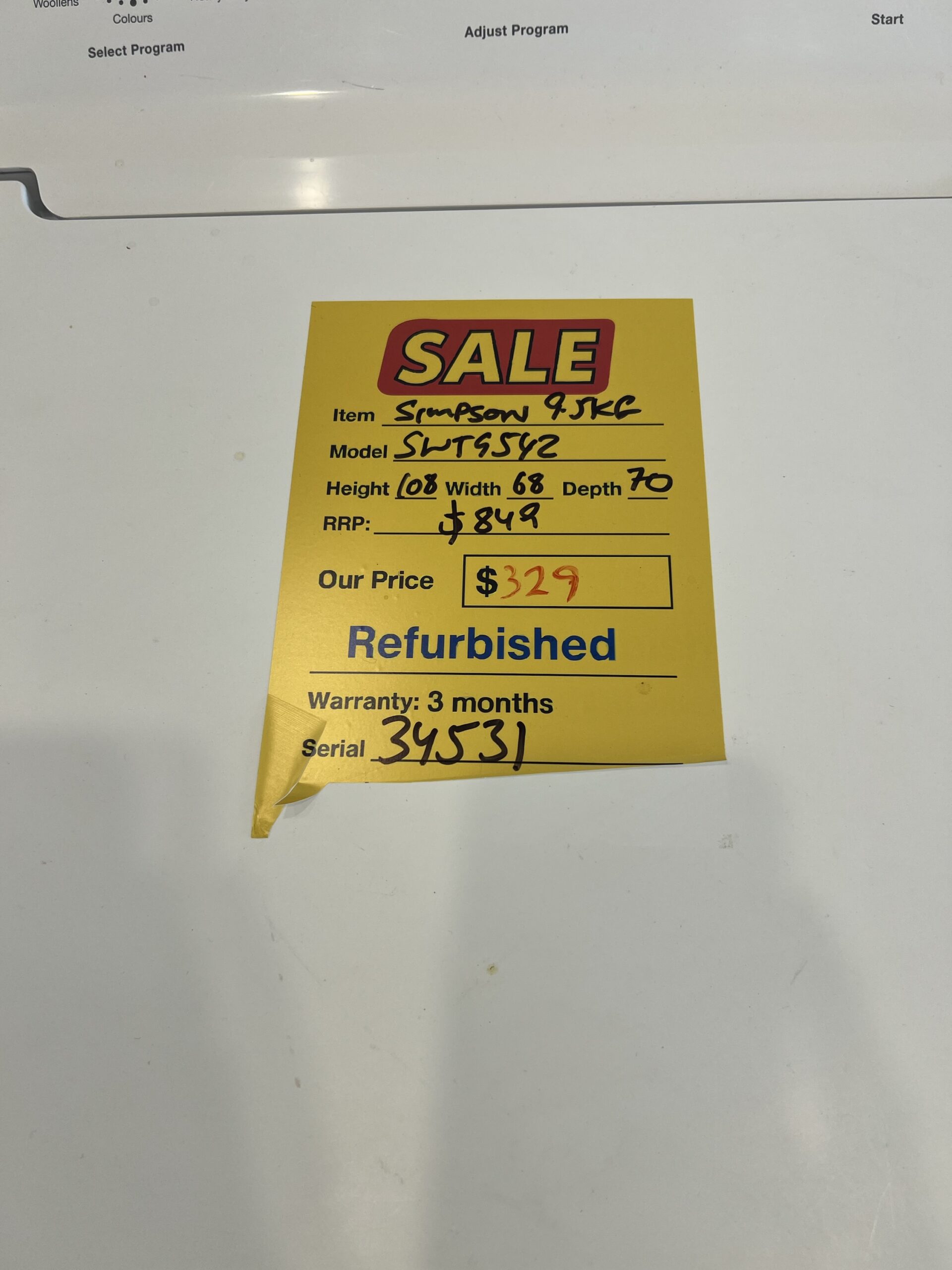 REFURBISHED SIMPSON 9.5 KG TOO LOADER WASHING MACHINE for $329