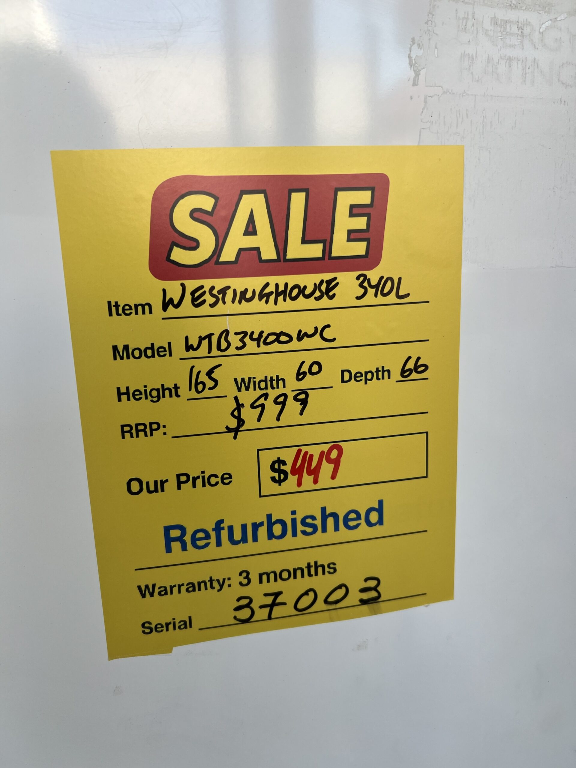 REFURBISHED WESTINGHOISE 340 L TOP MOUNT FRIDGE FOR $449