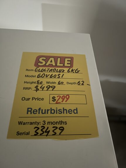 Refurbished Electrolux 6 kg dryer for $299 Brand: FISHER AND PAYKEL Model: De50f56e1 Capacity: 6 kg Dryer Dimensions: 80Height x